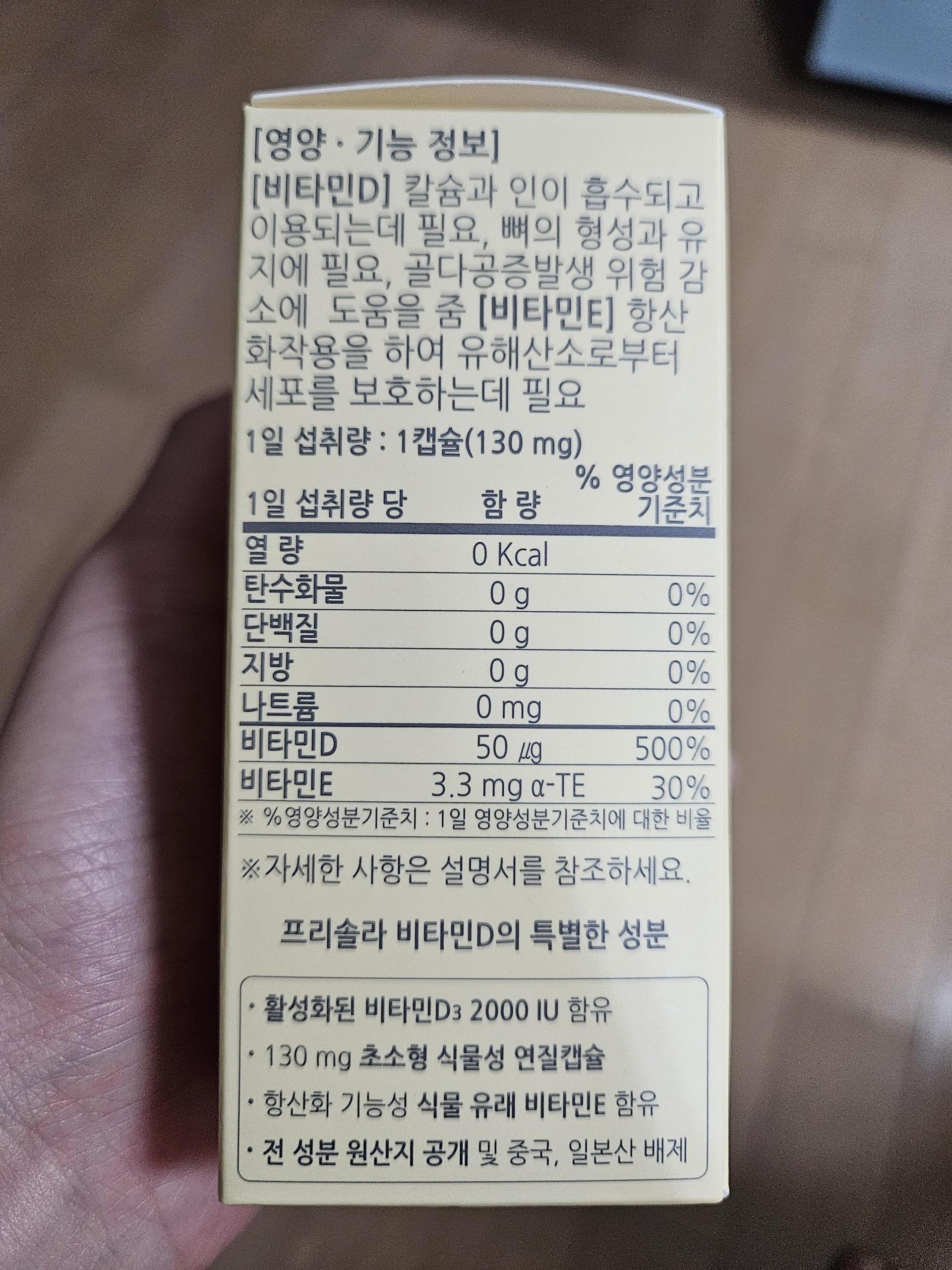 임신 중에 비타민D는 필수잖아요 ㅎㅎ 산부인과에서 비타민D 먹으라 해서 남편이 써치해서 알아낸 비타민D가 프리솔라 비타민D였어요 남편이 8개월치 사줘서 임신 중에, 출산 후까지도 꼬박꼬박 챙겨먹었어요 알이 작아서 먹기 편하고 한알만 먹으면 돼서 좋았어요 병원에서 제 담당 선생님은 1000IU만 되어도 된다고 하셨는데 2000IU라 넉넉하구요 덕분에 건강한 아기 출산했어요^^
