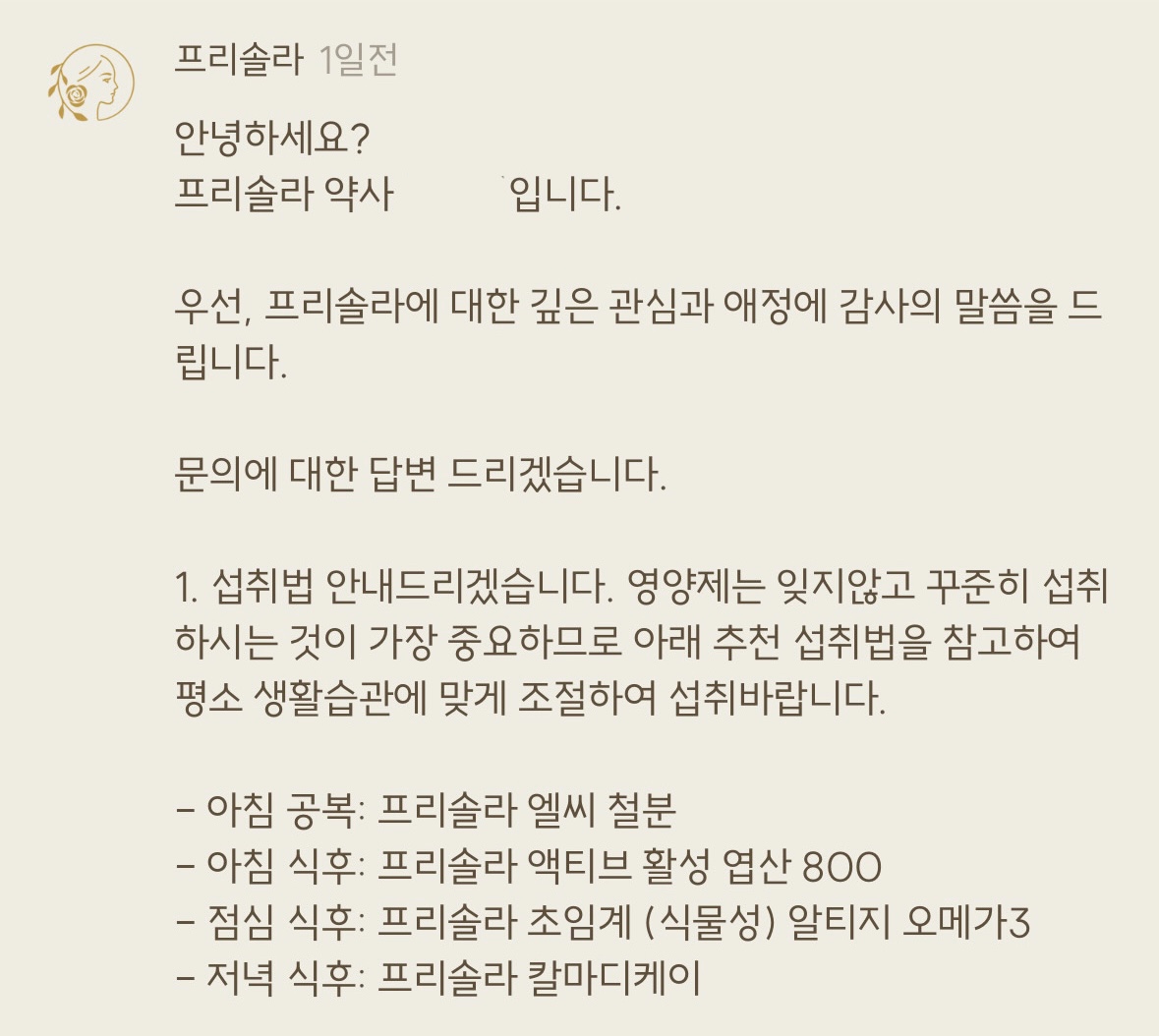 프리솔라의 다양한 영양제를 받아보고 어떤 영양제가 어디에 도움이 되는지 헷갈리는 부분도 있었는데, 약사님께서 자세하게 설명해주셔서 이해가 쏙쏙 되었어요 !