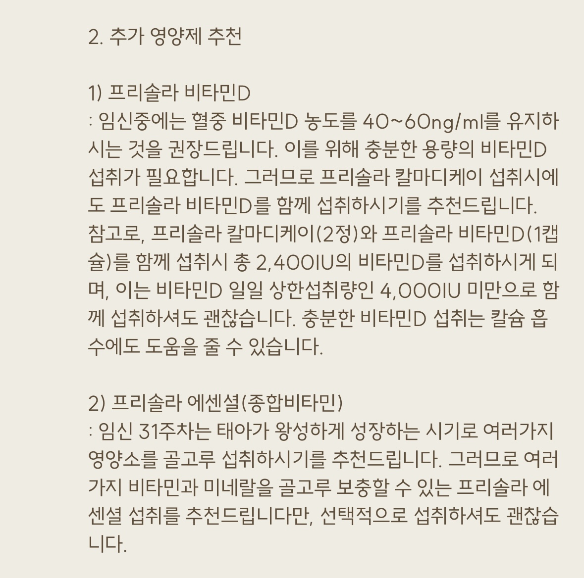 또, 임신 후기에 추가로 프리솔라의 “비타민 D와 에센셜(종합비타민)“을 추천해주셨어요