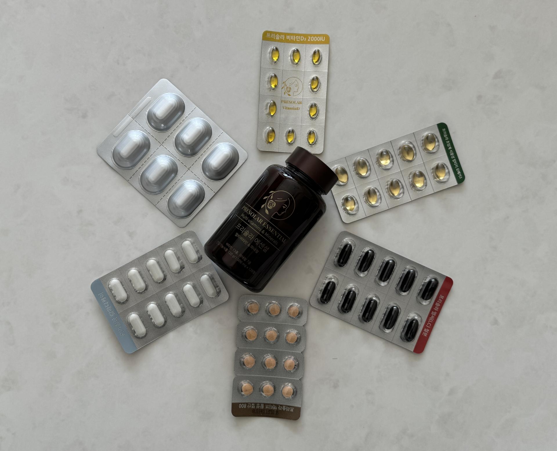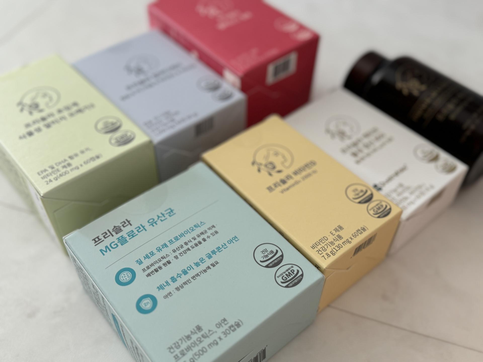 : 현재 저는 총 7가지(유산균, 엽산, 철분, 오메가3, 칼마디, 에센셜(종합비타민), 비타민D) 영양제를 섭취 중입니다.