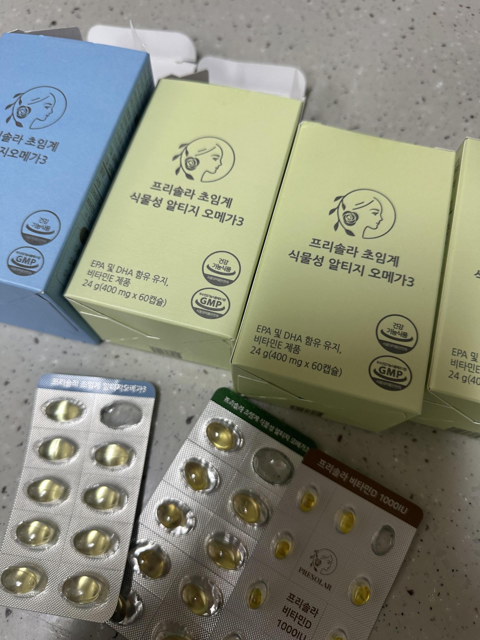 프리솔라는 딱 나뉘어져 제품이 구성되어있고 초록색 오메가와 파란색 오메가 한알씩 먹는 것을 추천해주신다 하셔서